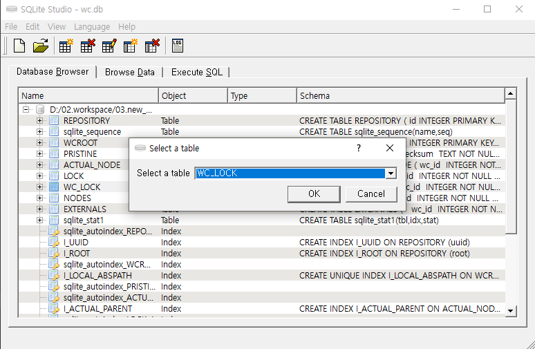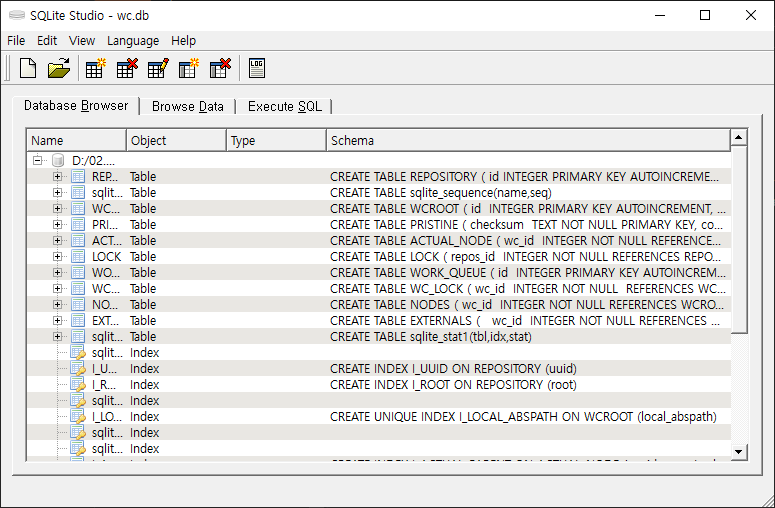 - 만약 위의 명령어가 실행되지 않는다면, 직접 sqLite를 실행하여 [File] - [Open Database]를 누른 후 프로젝트 .svn 폴더 내의 wc.db 파일을 open한다.