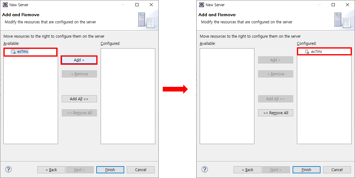 - 생성한 서버의 프로젝트를 선택해준 뒤 Finish