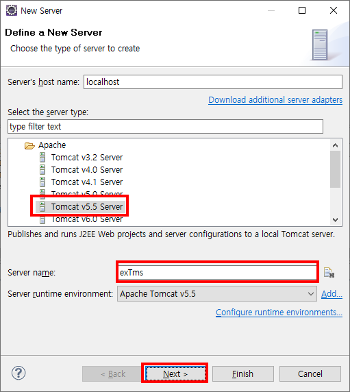 - Tomcat 5.5 선택 후 서버명을 설정해준다.