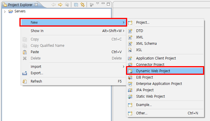 - Project Explorer 창에서 [마우스 우키] - [New] - [Dynamic Web Project] 클릭