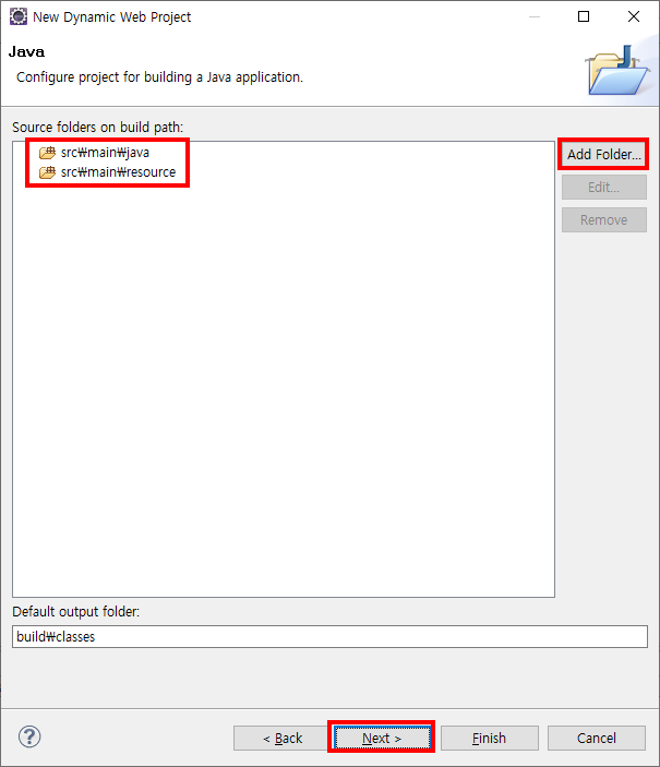 Default로 src 폴더만 있었을 것이다. 폴더를 삭제한 뒤 Add Folder를 클릭하여 "src\main\java" 와 "src\main\resource"를 생성한다.