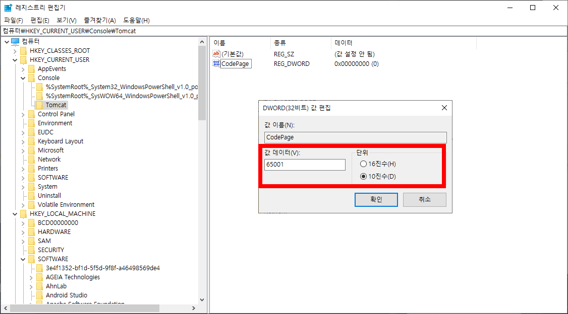 - 추가한 값의 이름을 "CodePage"로 변경한 뒤 값을 아래와 같이 변경한다.