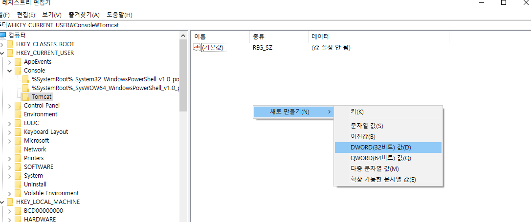 해당 키의 이름은 "Tomcat" 으로 입력하고, 해당 키 값 안에 DWORD(32비트) 값을 하나 추가해준다.