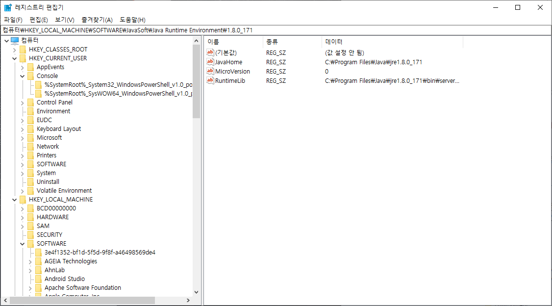 - 실행창 [WINDOW + R]을 누른 뒤 "regedit"을 입력하여 레지스트리 편집기를 연다.