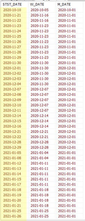 먼저 TEST_TABLE의 STST_DATE 날짜의 각 주, 월 기준 날짜를 구해보자.
