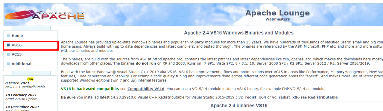 Apache VS16 binaries and modules download