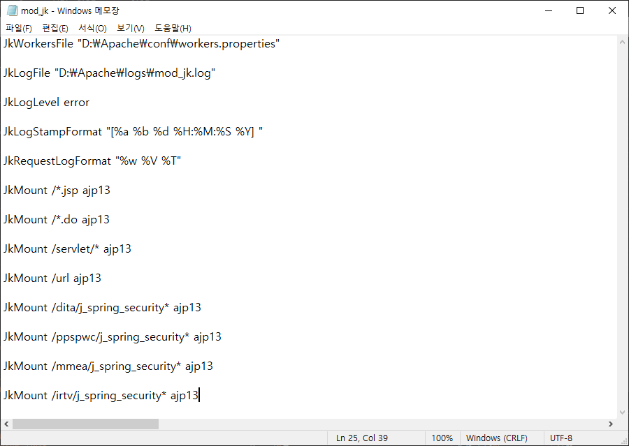 mod_jk.conf 파일을 conf 경로에 메모장으로 생성한 후 다음 내용 추가