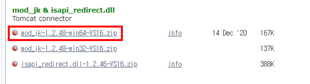 클릭한 뒤 스크롤을 내리면 mod_jk 해당하는 OS bit(64bit)로 다운로드