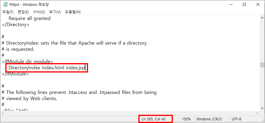 ① DirectoryIndex 라인을 찾아 아래 내용 추가 (약 285라인)