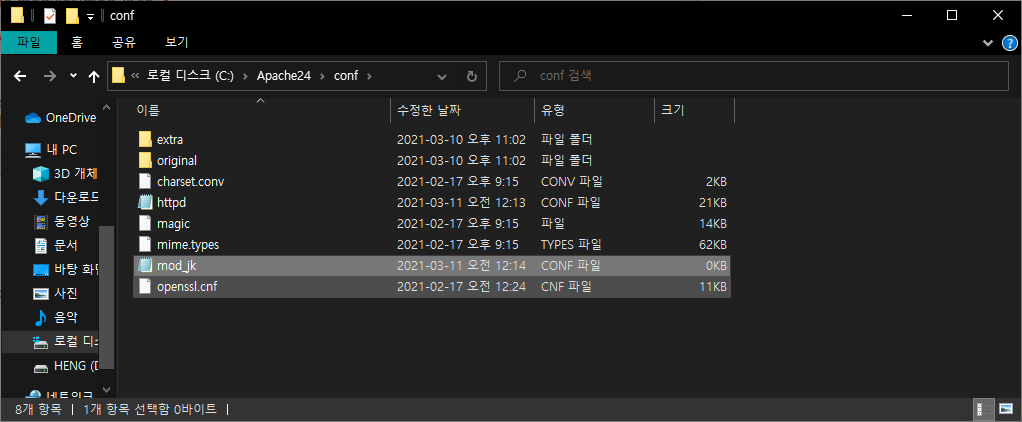 다운로드 파일 압축을 해제한 뒤 mod_jk.so 파일을 Apache의 modules 폴더로 복사 또는 이동