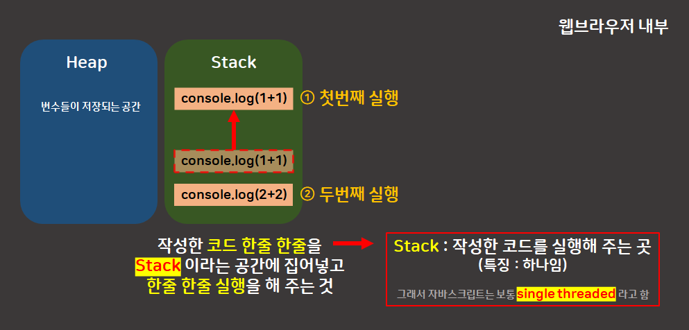 Stack은 하나 뿐이기때문에 한 번에 코드 하나밖에 실행할 수 없다.