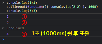 다음과 같은 코드를 실행하려고 할 때 자바스크립트는 첫 번째와 세 번째 코드를 실행한 후 1초 쉬고, 두 번째 코드를 실행한다.