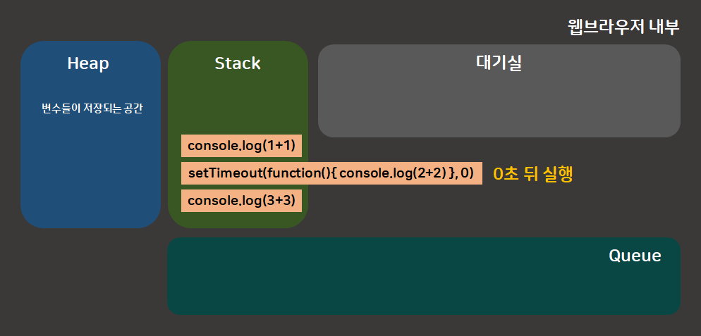 setTimeout 과 같이 바로 실행시킬 수 없는 코드는 Stack에 쌓여있지 않고, 그림과 같이 대기실에 제껴놓고 실행을 한다.