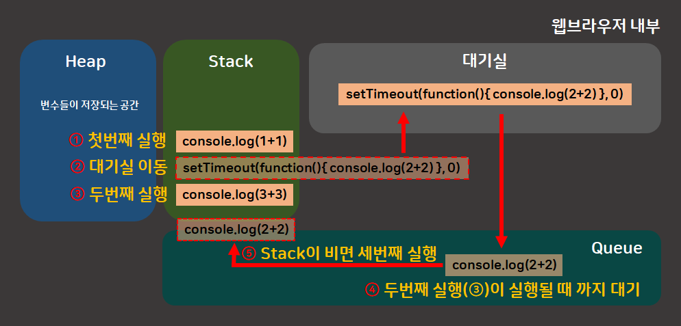 setTimeout의 1초가 지난 경우, 대기실에서 코드를 옮겨와야하는데 바로 Stack에 담기는 것이 아닌 Queue에 대기가 끝난 코드가 순서대로 쌓인다.