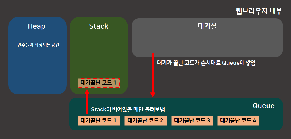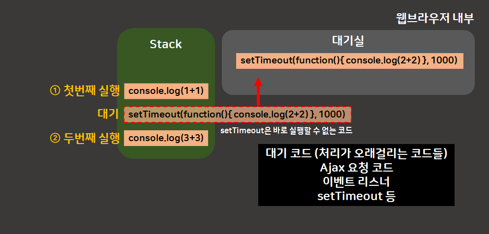 Ajax 요청 코드과 같이 서버에 데이터를 요청하는 경우, 이벤트 리스너와 같이 버튼을 누를 때까지 대기해야하는 코드, setTimeout 등 기다림이 필요한 코드들을 대기실에 올려놓는다.