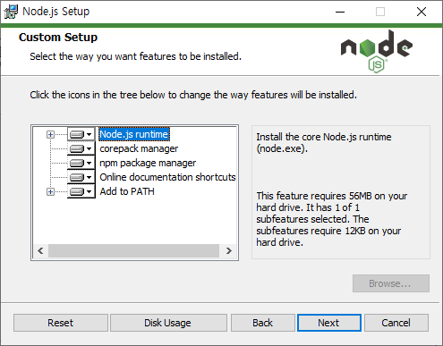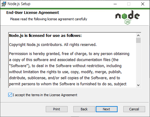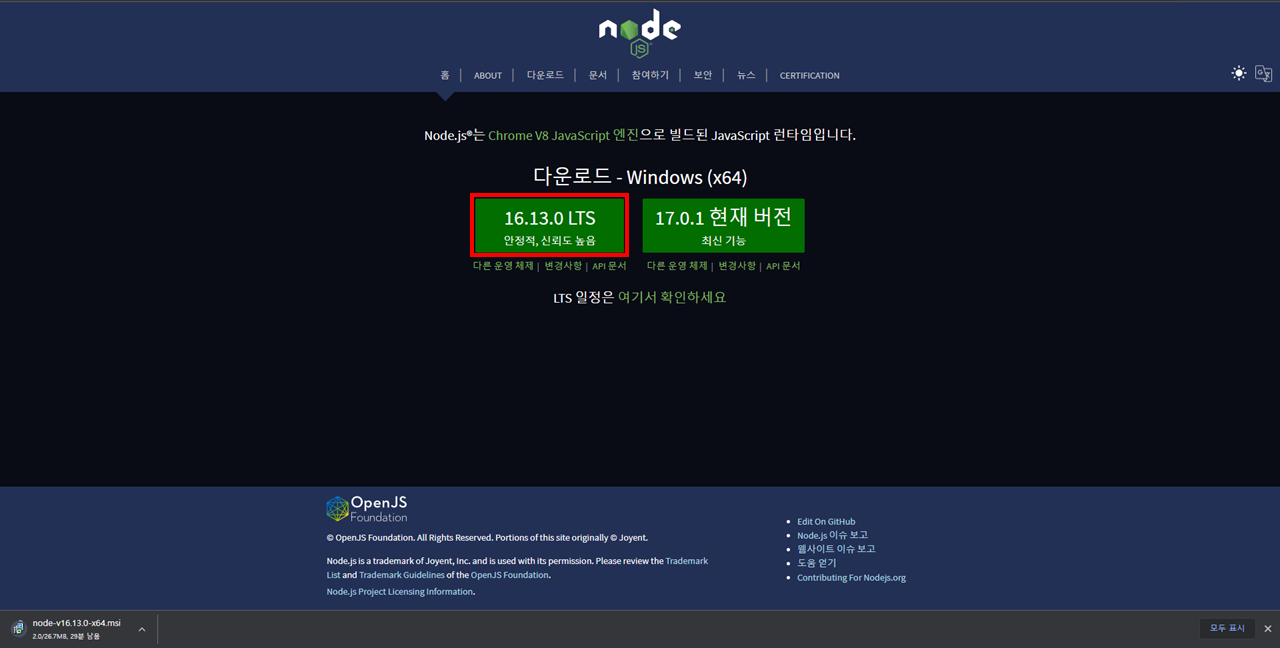 글쓴이가 포스팅한 nodejs 버전과 다를 수 있다. 다운로드받는 시점에서 가장 최신버전을 받는 것이 좋다.