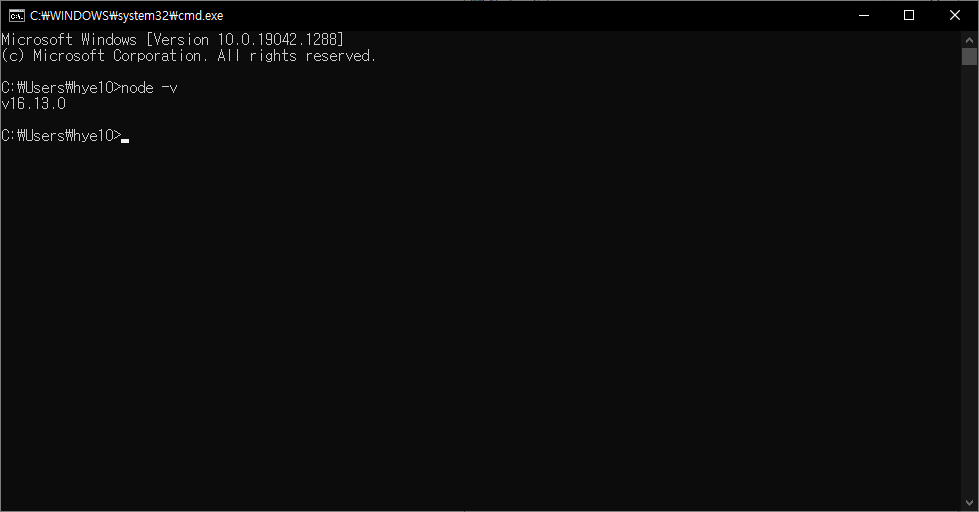 명령 프롬프트 창을 열어 node -v 를 입력하면 설치한 node js의 버전이 나온다.