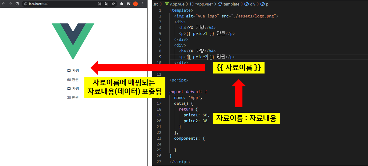 뷰 인스턴스의 data 객체의 속성들을 {{}} - 콧수염괄호를 사용하여 데이터 텍스트를 삽입한다.