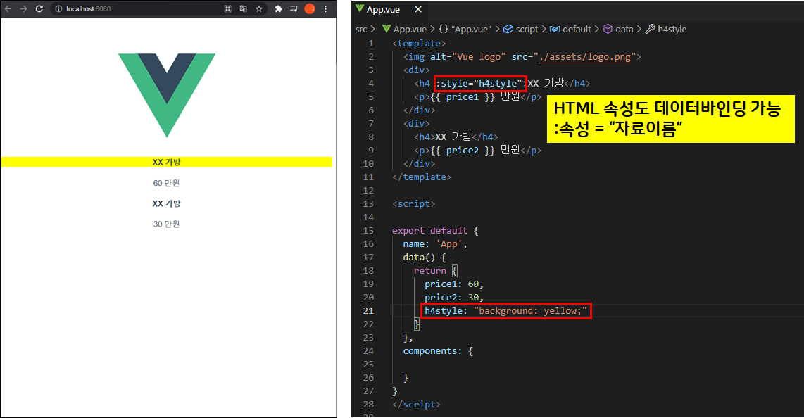<h4 v-bind:style="h4style">XX 가방</h4> // v-bind: 의 v-bind 생략 가능
