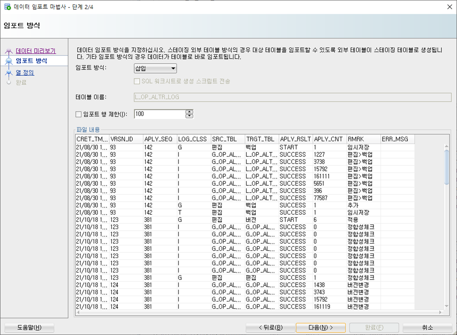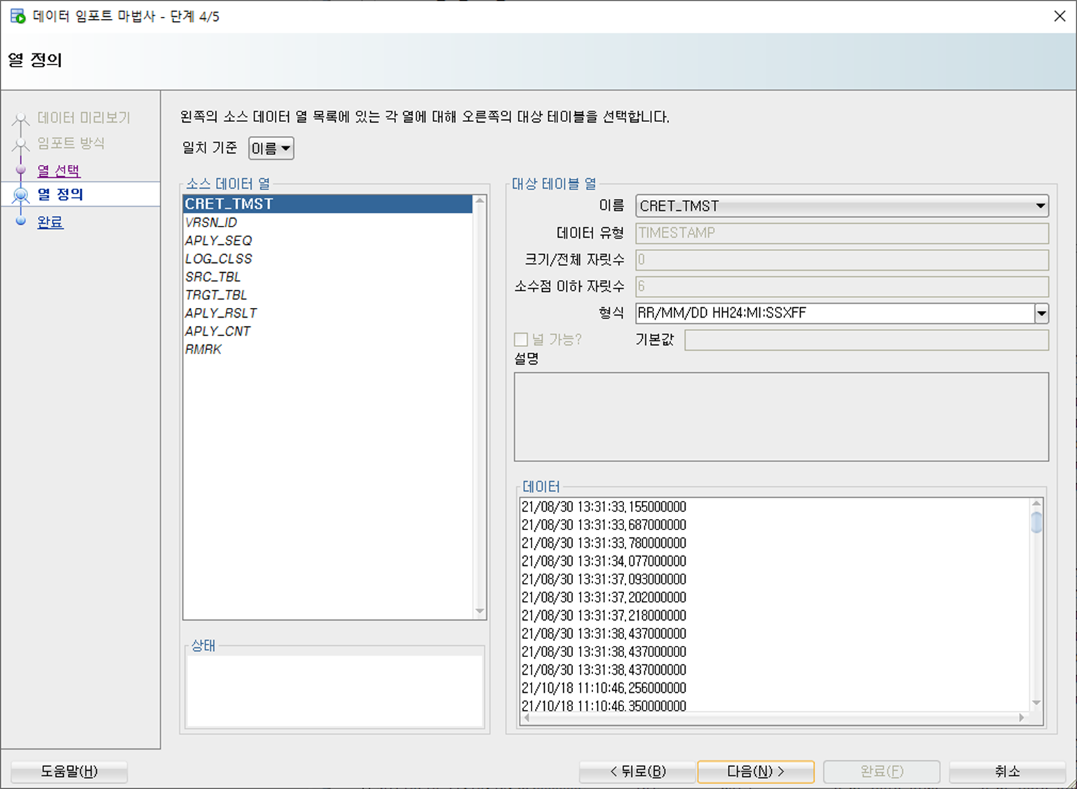 선택된 열 : 임포트할 데이터 컬럼