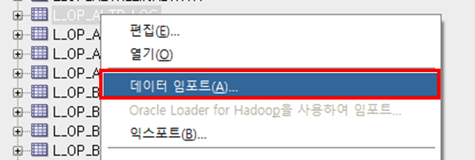 데이터 임포트할 테이블 마우스 우측 키 클릭 + 데이터 임포트 선택