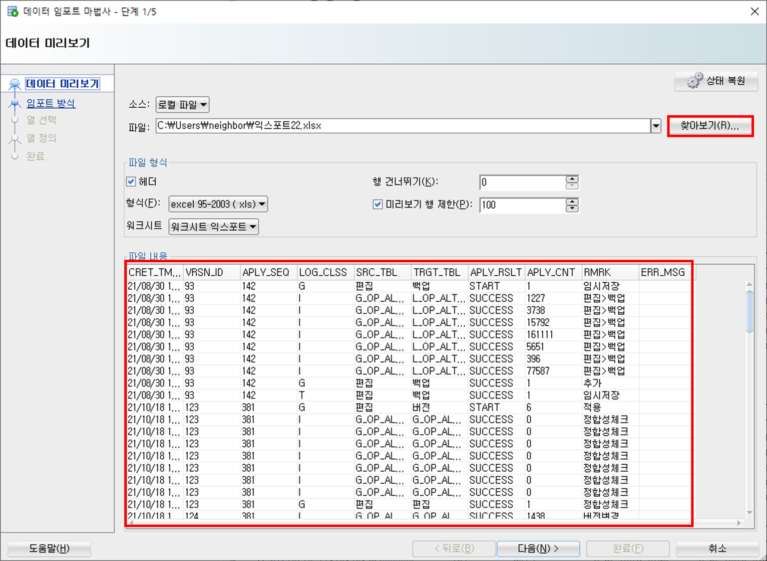 데이터 임포트할 파일 선택