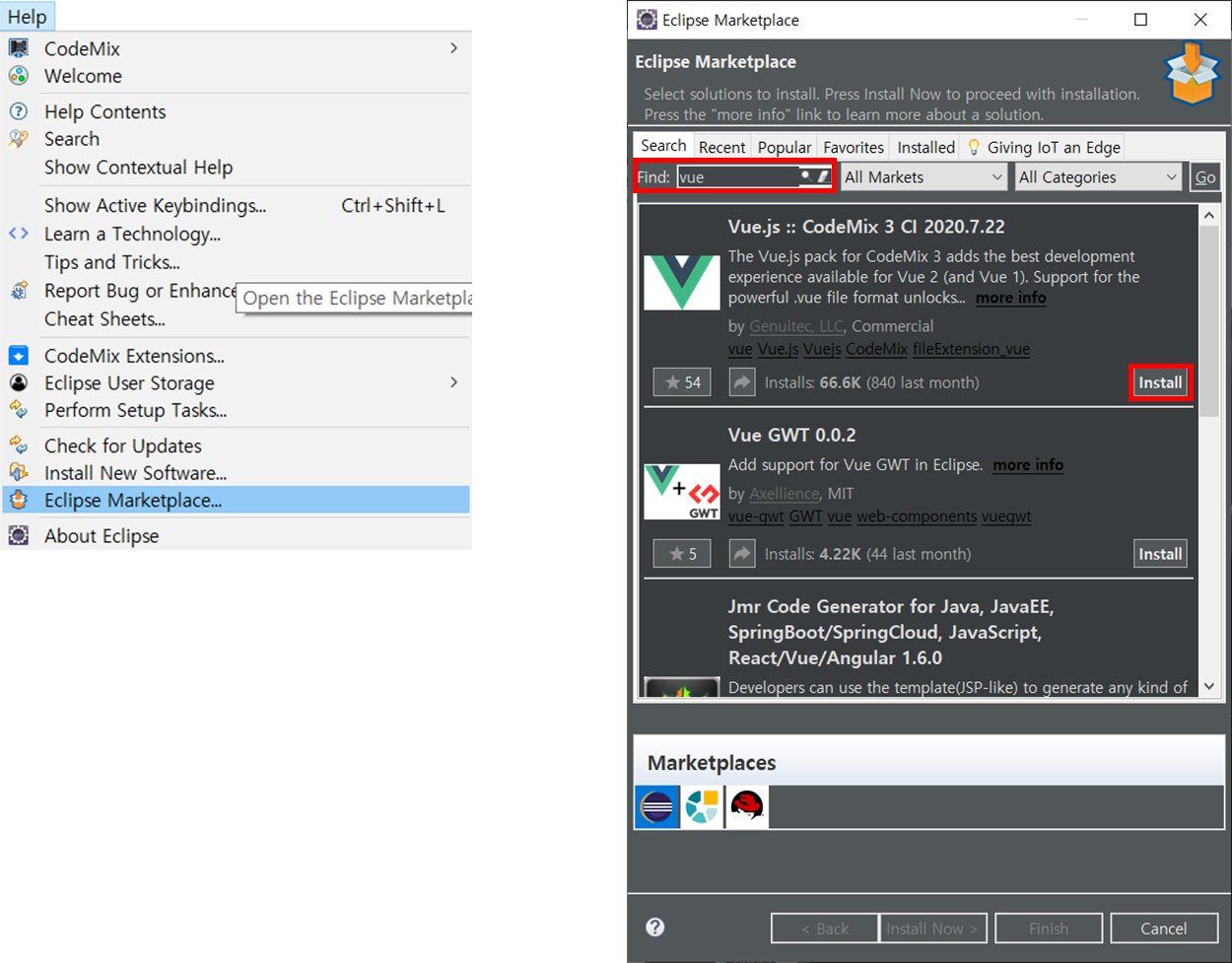 이클릭스 상단에 Help - Eclipse Marketplace... 선택하여 Find 에 vue를 검색해 install 을 눌러 Next 클릭 후 약관에 동의한 후 설치를 완료하자.