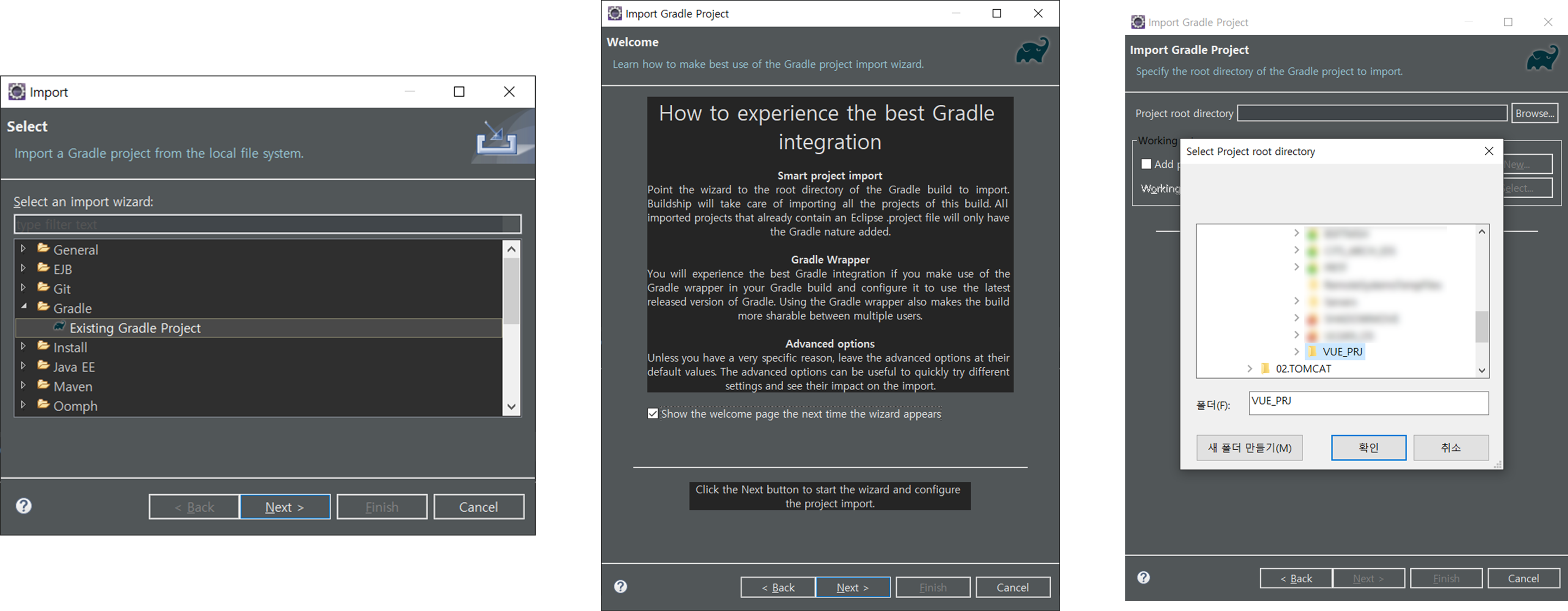 Project Explorer 위치에 마우스 우클릭 - import - Existing Gradle Project 선택하여 압축해제한 Vue 프로젝트를 선택하여 Next - .. - Finish로 프로젝트 임포트를 완료해주자.