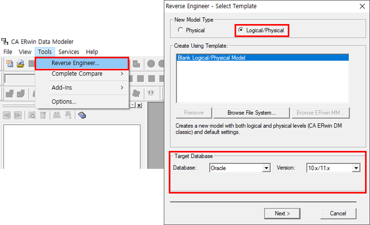 [Tools] - [Reverse Engineer...] - [Logical/Physical] - Next