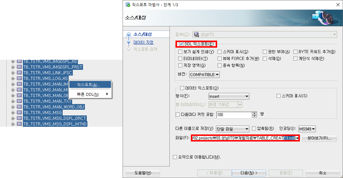 DDL 익스포트만 체크한 뒤 (데이터 익스포트는 해제한다) 원하는 경로에 저장한다.