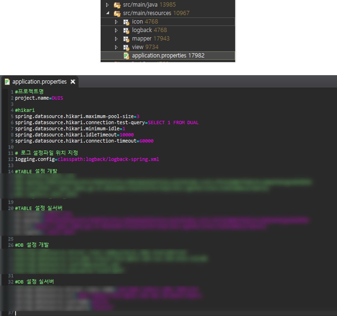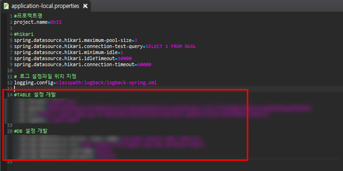 개발과 실서버 환경에 따라 DB 설정과 TABLE 설정을 달리하는 것을 알 수 있다.