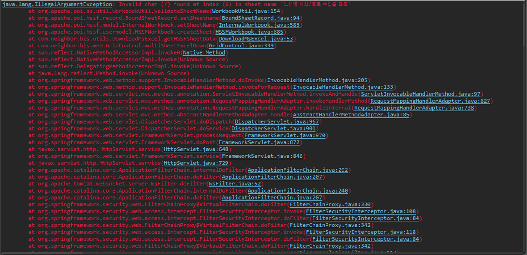 java.lang.IllegalArgumentException: Invalid char (/) found at index (6) in sheet name '노선별 시작/종료 수집율 목록'