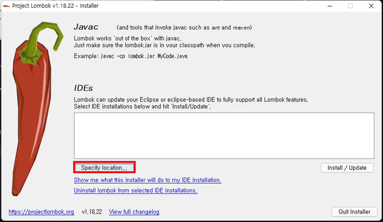 lombok.jar 파일이 있는 위치에서 lombok.jar 파일을 실행시킨다.