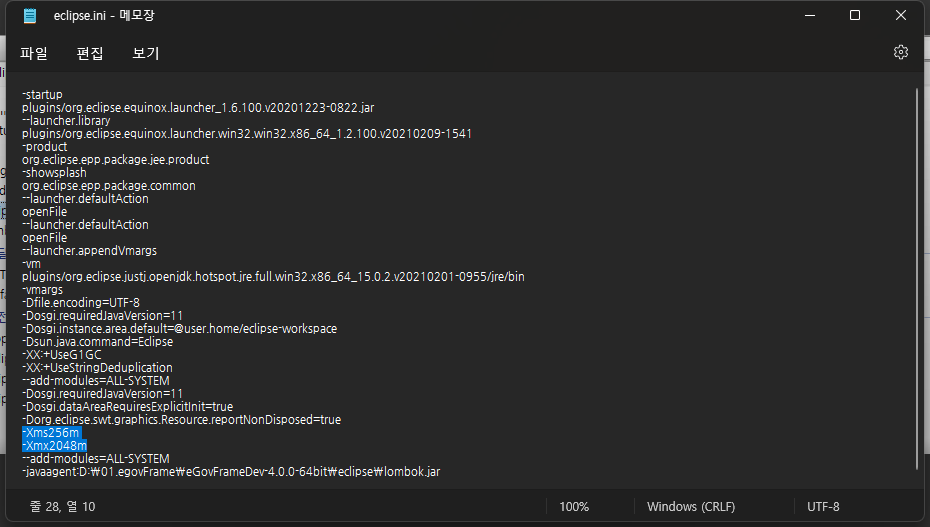 마찬가지로 다운로드 받은 eclipse 경로에 eclipse.ini 파일을 [마우스 우키 + 편집] 하여 파일을 연다.