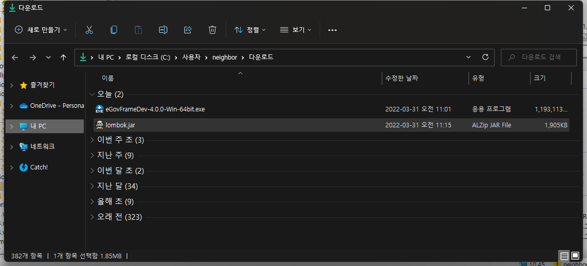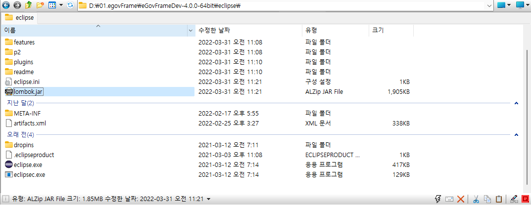 그리고 다운받은 전자정부의 eclipse 경로에 들어가면 lombok.jar 파일이 생성된 것을 확인할 수 있다.