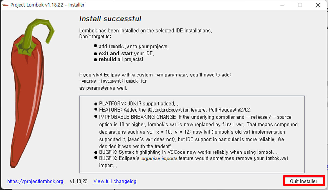 Quit Installer 를 클릭하면, 설치가 종료된다.