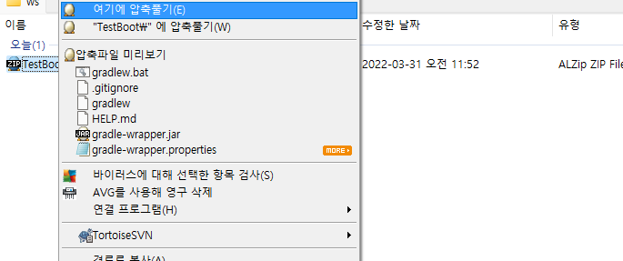다운받은 압축파일은 본인의 이클립스 workspace 경로에 옮긴 뒤에 "여기에 압축풀기" 를 클릭하여 압축을 풀어야 프로젝트 임포트할 때 편리하다.