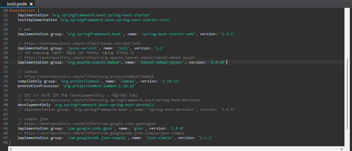 implementation group: 'org.springframework.boot', name: 'spring-boot-starter-web', version: '2.6.5'