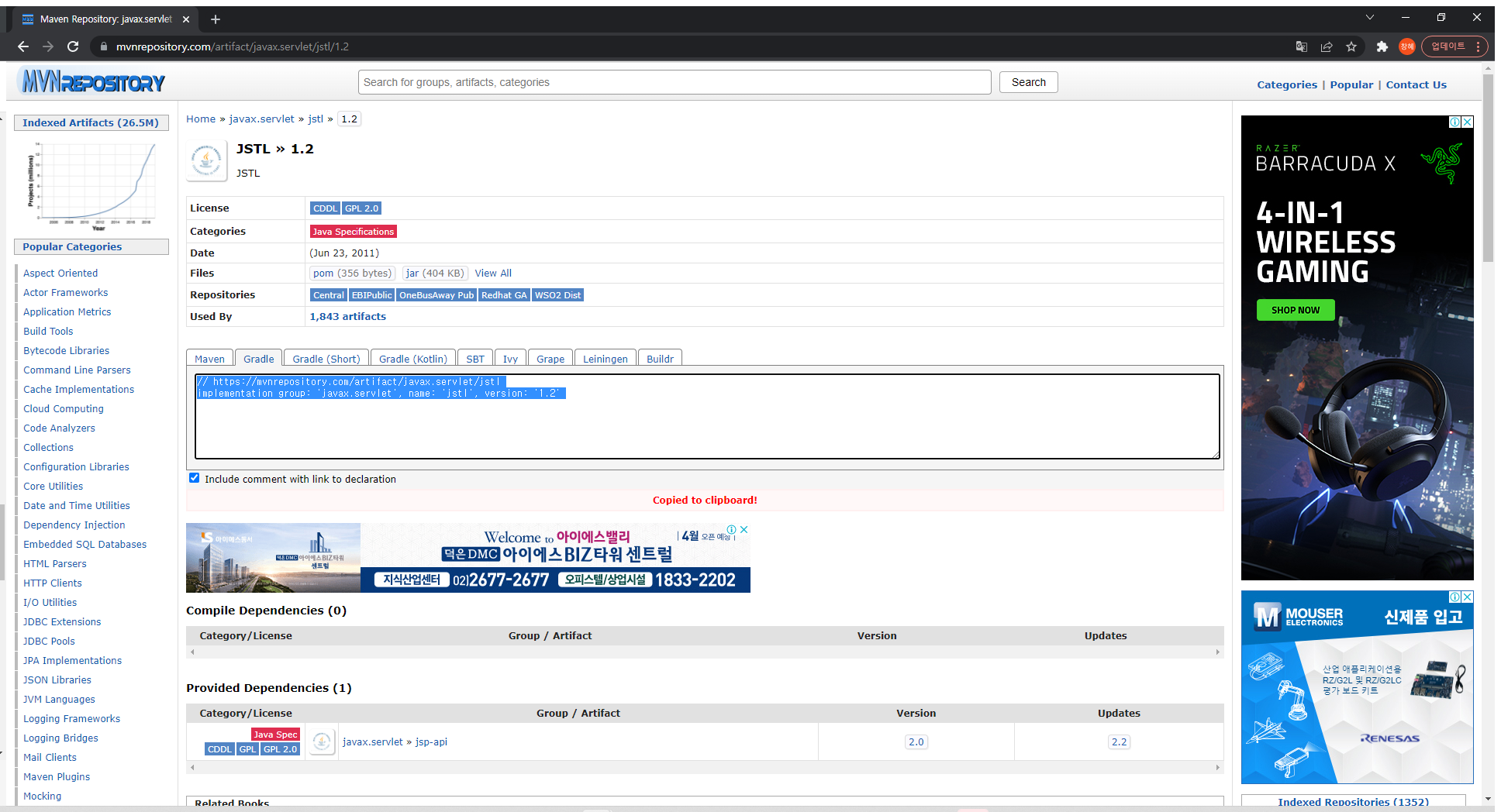 필자는 가장 최신 버전인 1.2 버전을 클릭하였고, Gradle Tab 의 implementation group 정보를 그대로 복사하여 build.gradle 에 추가해주면 된다.만약 지금 게시물과는 번외로, Maven Project 인 경우에는 Maven Tab을 클릭하여 추가해주면 된다.