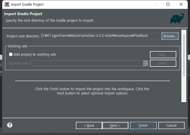 다음 화면에서 Browser 를 선택하여 이전에 압축해제한 파일을 선택한 뒤 Finish를 클릭한다.