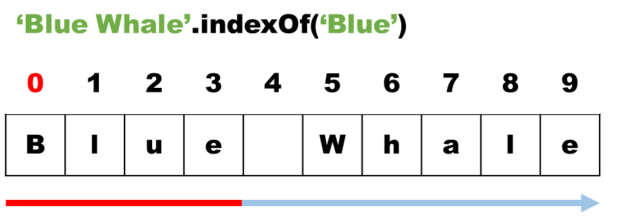 'Blue Whale'.indexOf('Blue'); // returns 0