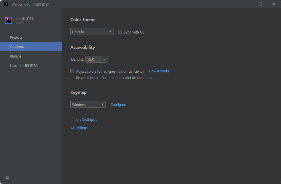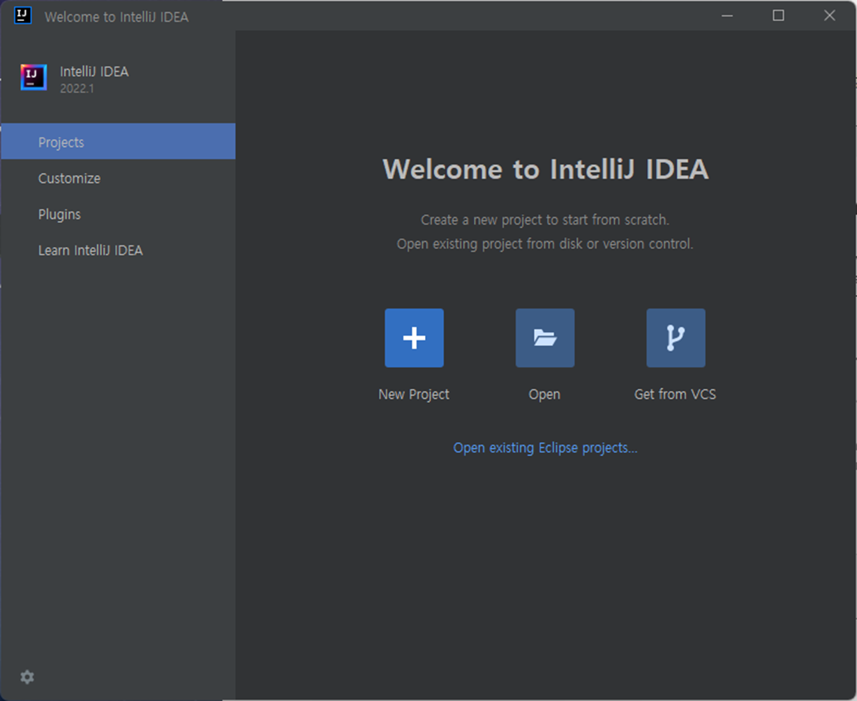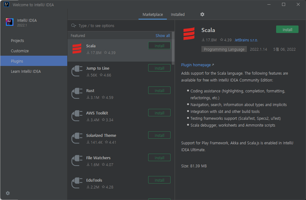 - Marketplace : 새로운 플러그인(프로그래밍 언어, 라이브러리, 빌드 툴 등)을 검색 및 설치할 수 있다