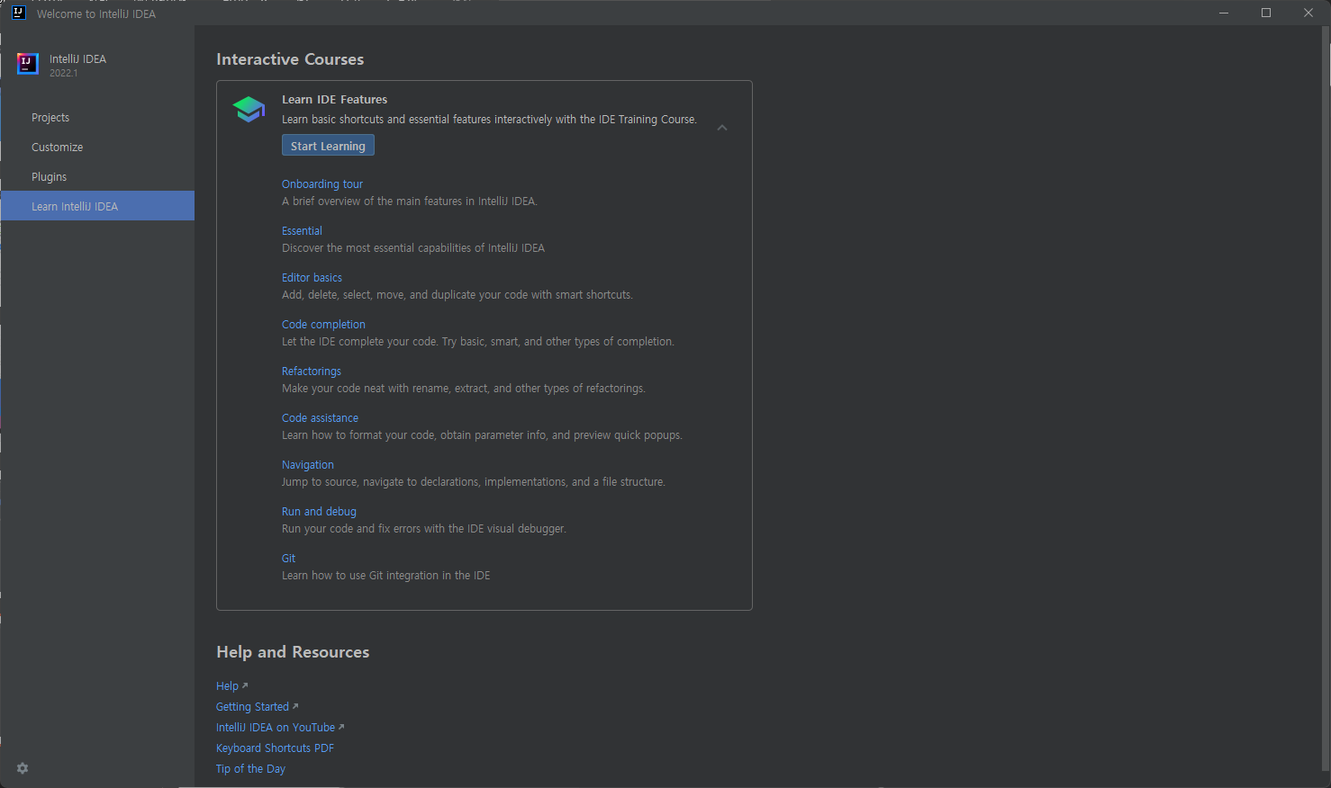 - Start Learning : IntelliJ 사용법과 기본 단축키를 배울 수 있는 트레이닝 코스를 시작한다.