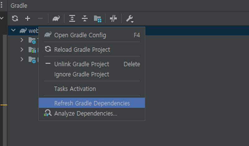 Gradle 창에 Gradle 프로젝트에 커서를 두고 마우스 우키 - Refresh Gradle Dependencies