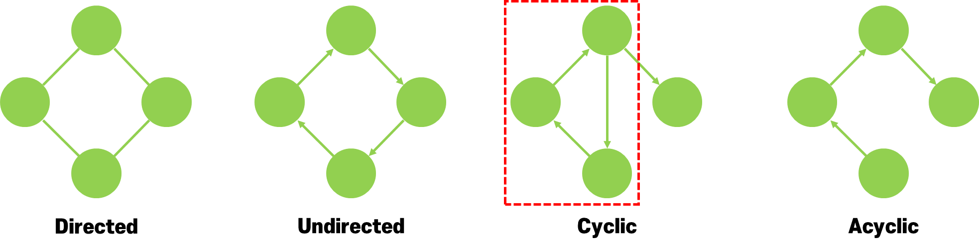 또한, 그래프(Graph)는 노드들이 하나 이상의 서클(Circle) 을 만드는 경우(Cyclic)가 있고, 하나도 없는 경우(Acyclic)가 있다.