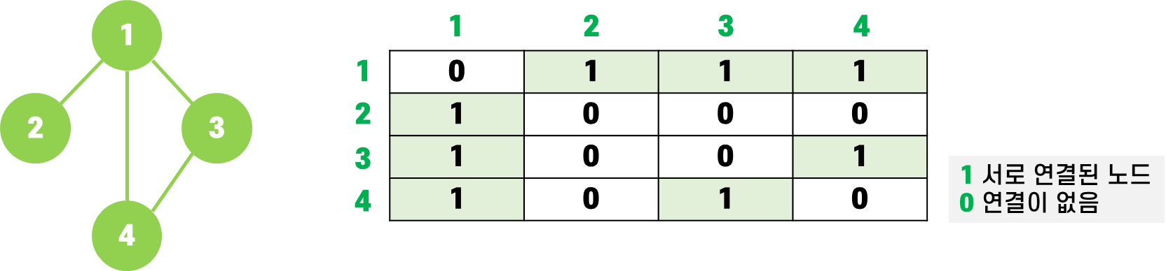 - Adjacency Matrix : 그래프를 표에다가 표현하는 방법 (이차원 배열 표현)