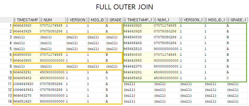 FULL OUTER JOIN B ON(B.TIMESTAMP = A.TIMESTAMP AND B.NUM = A.NUM)