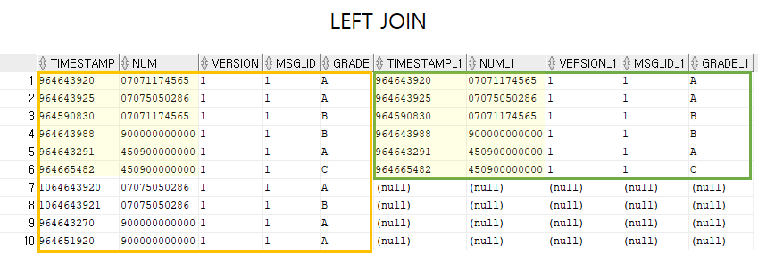 키 값인 TIMESTAMP와 VIN이 매칭되는 데이터를 함께 보여주고 있지만, 왼쪽 테이블(A)를 기준으로 매칭되지 않는 데이터까지 보여주고 있다.