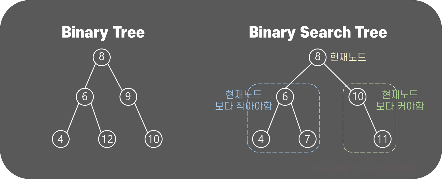 binary tree (이진 트리)의 데이터가 왼쪽 노드와 그 이하 자식노드는 현재 노드보다 작아야하고, 오른쪽 노드와 그 이하 자식노드는 현재 노드보다 커야한다.