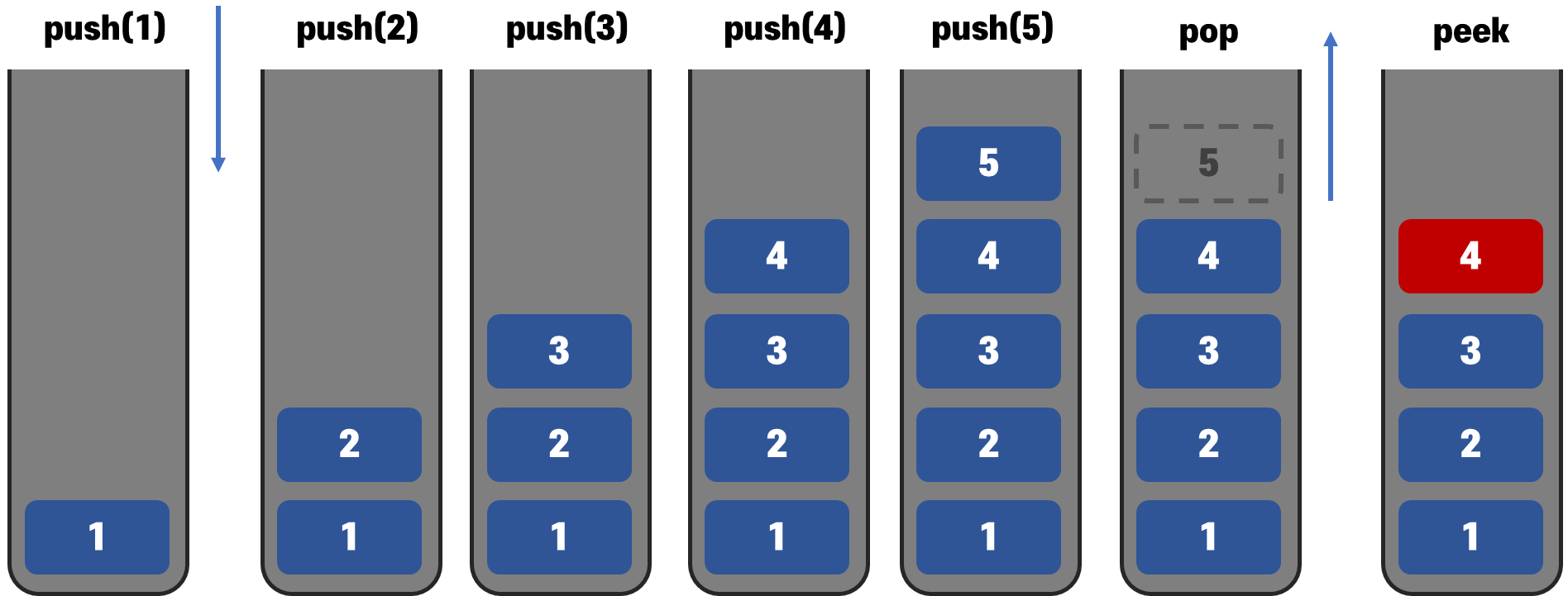 2. 한 쪽 끝에서만 데이터를 넣고 뺄 수 있는 자료 구조여서 데이터를 쌓는 형식으로 저장하며 조회, 추가, 삭제 등 모두 가장 위에 있는 (가장 마지막에 삽입된) 값에서 이루어진다. 이 데이터를 Top이라고한다.